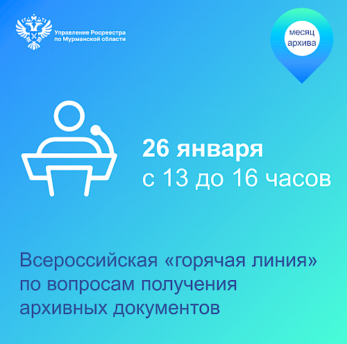 26 января с 13.00 до 16.00 Росреестр проведет всероссийскую «горячую линию» по вопросам получения архивных документов. Мурманчане смогут задать свои вопросы по телефону: 8 (8152) 56-70-01.