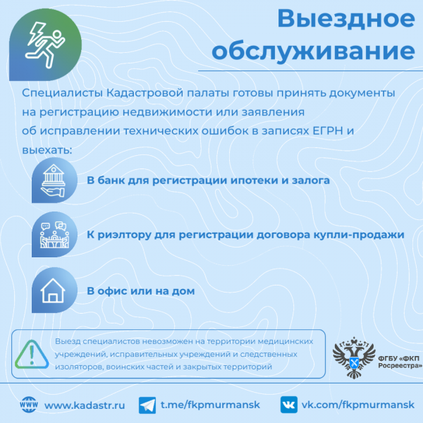 Выездное обслуживание. Для удобства северян в учреждении работает выездное обслуживание по приему заявлений о ГКУ и (или) ГРП и запросов сведений из ЕГРН, а также курьерская доставка готовых документов. Данные услуги оказываются на возмездной основе.