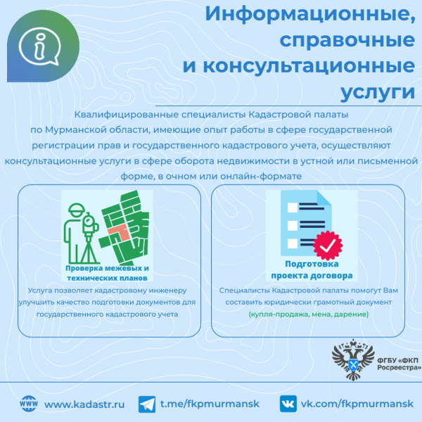 Оказание информационных, справочных и консультационных услуг. Консультационные услуги в сфере оборота недвижимости также являются платными. Специалисты Кадастровой палаты, имеющие большой опыт работы в этой сфере, помогают, в частности, готовить пакеты документов и составлять договоры для регистрации сделок с недвижимостью, осуществляют предварительную проверку документов межевых и технических планов, актов обследования и других документов. Эти услуги улучшают качество подготовки документов для государственного кадастрового учета и госрегистрации прав.