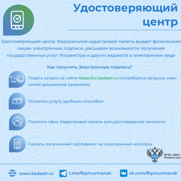 Оказание услуг Удостоверяющего центра по выдаче сертификатов электронной подписи. Удостоверяющий центр Федеральной кадастровой палаты выдает физическим лицам электронные подписи, расширяя возможности получения государственных услуг Росреестра и других ведомств в электронном виде.