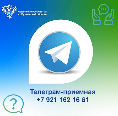 В Управлении Росреестра по Мурманской области работает Телеграм-приемная для оперативного решения проблемных вопросов жителей региона по кадастровому учету и регистрации прав на недвижимое имущество, государственному земельному надзору, землеустройству, геодезии и картографии, а также банкротству физических и юридических лиц.
