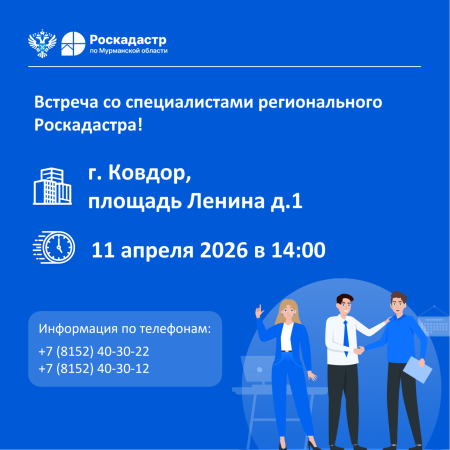 В субботу, 11 апреля 2026 года филиал ППК «Роскадастр» по Мурманской области проведет встречу для жителей Ковдорского муниципального округа.