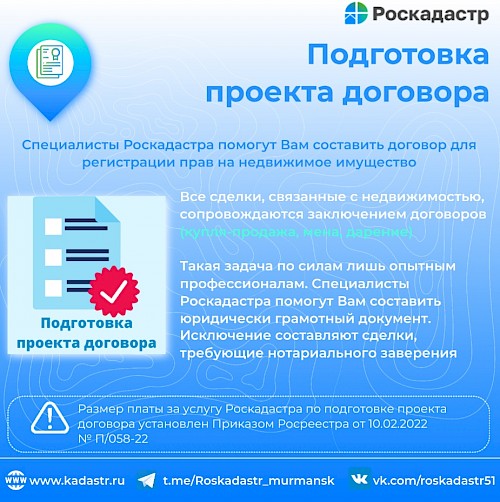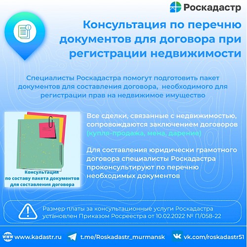 Роскадастр по Мурманской области оказывает гражданам платные консультационные услуги в сфере оборота недвижимости. Специалисты учреждения помогают подготовить пакет документов и составить договор в сфере недвижимости для дальнейшей регистрации прав на недвижимое имущество. Исключение составляют только сделки, требующие нотариального заверения.
