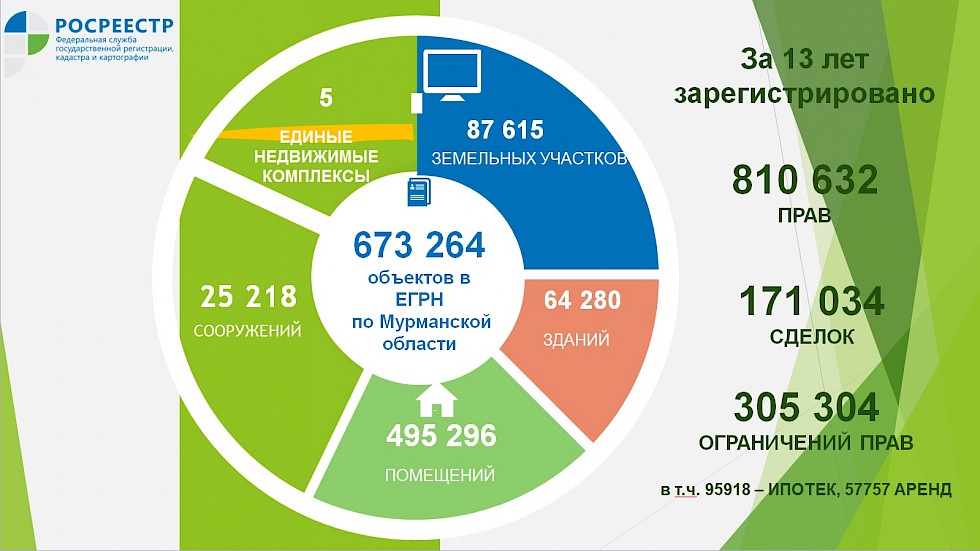За эти 13 лет Управление Росреестра по Мурманской области зарегистрировало более 800 тысяч прав на объекты недвижимости, 170 тысяч сделок, 305 тысяч ограничений и обременений прав, так их как аренда, ипотека, доверительное управление.
