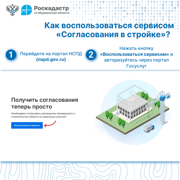 Сервис «Согласования в стройке» портала «Национальная система пространственных данных» (НСПД) предназначен для оптимизации строительства на этапе получения исходно-разрешительной документации, для получения/предоставления государственных услуг по согласованию строительства в части использования пространственных данных.