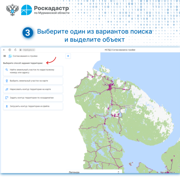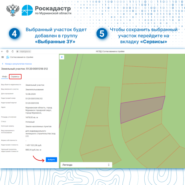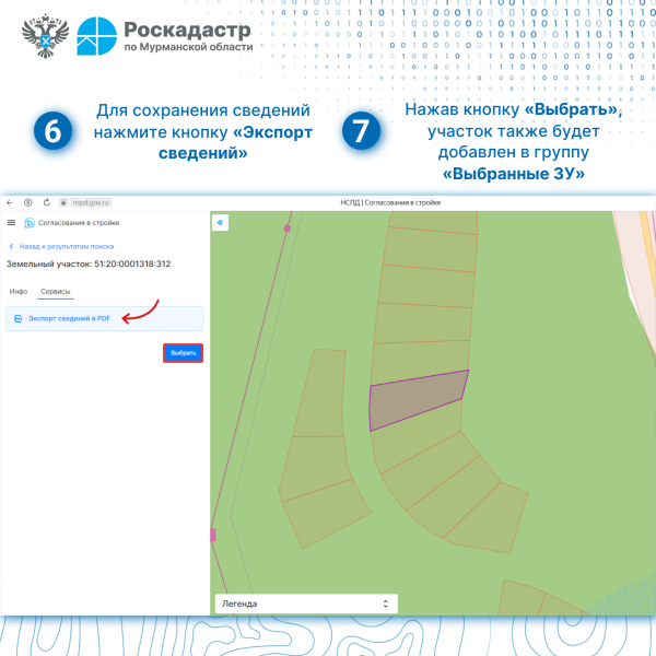 - поиск и экспорт сведений о территории, необходимых для подачи заявления на получение государственных услуг по согласованию строительства;