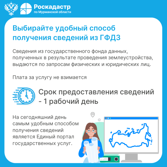 В филиале ППК «Роскадастр» по Мурманской области на хранении находится более 32 тысяч материалов государственного фонда данных, полученных в результате проведения землеустройства (ГФДЗ). Материалы ГФДЗ содержат ценную исходную информацию об объектах недвижимости и при возникновении земельных споров позволяют подтвердить факт существования земельного участка, а также факт установления границ участка на момент его предоставления и формирования.