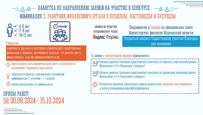 С информацией о сроках проведения, условиях конкурса, а также Положением о конкурсе творческих проектов «Бюджет для граждан» в 2024 году, можно ознакомиться на сайте Министерства финансов Мурманской области в разделе «Открытый бюджет/Общественное участие/Конкурсы для населения/Конкурс творческих проектов «Бюджет для граждан». 2024 год»