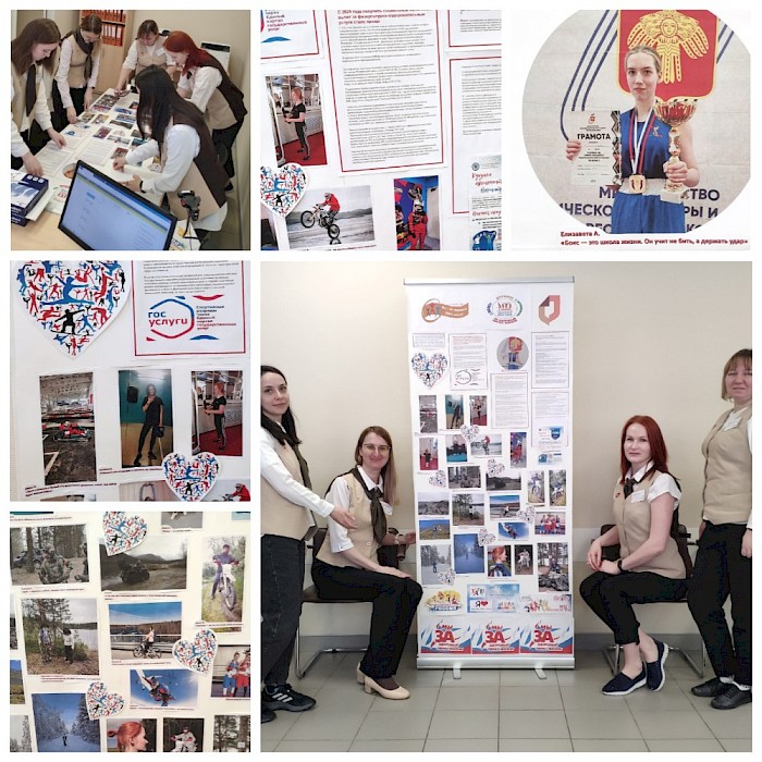 Экспозицию украсили спортивные фотографии и мотивационные высказывания сотрудников МФЦ и членов их семей. Специалисты по работе с заявителями делятся снимками прыжков с парашютом, поездок на мотоциклах, велосипедах, квадроциклах, покорения горных вершин, тренировок в тренажерных залах, бокса и йоги, рыбной ловли и участия в экологическом десанте по сбору мусора в лесу.